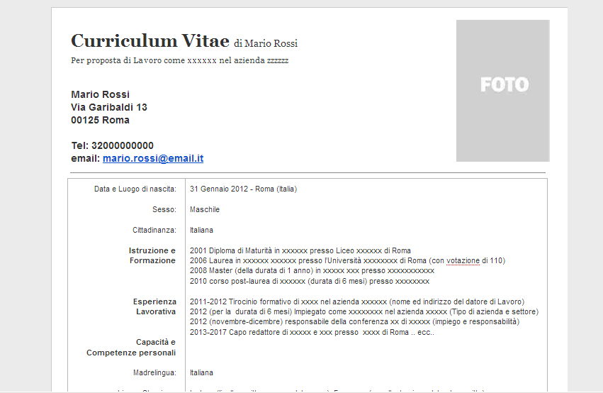 Curriculum Vitae Europass from onn.chultane5000.pw Tutti questi modelli hanno l'imapginazione standard e sono precompilati con delle linee guida che spiegano cosa inserire nei determinati campi. Mettendo in risalto in modo determinante le tue abilità e conoscenze, questo formato di cv ti aiuterà a compiere il primo passo e ottenere il tuo primo colloquio. Se invece volete un modello più personalizzato potete andare su questa pagina per visualizzare tutti i cv disponibili. Scarica subito questo curriculum da compilare in italiano! Se cerchi un modello di cv in italiano per word, questo formato soddisferà le tue esigenze. Questo modello grafico di cv può essere adattato a ogni profilo professionale. Qui potete scegliere e visualizzare il modello cv che preferite. Se sei un ingegnere, un rappresentante, un economista… questo modello può essere quello che ti serve.